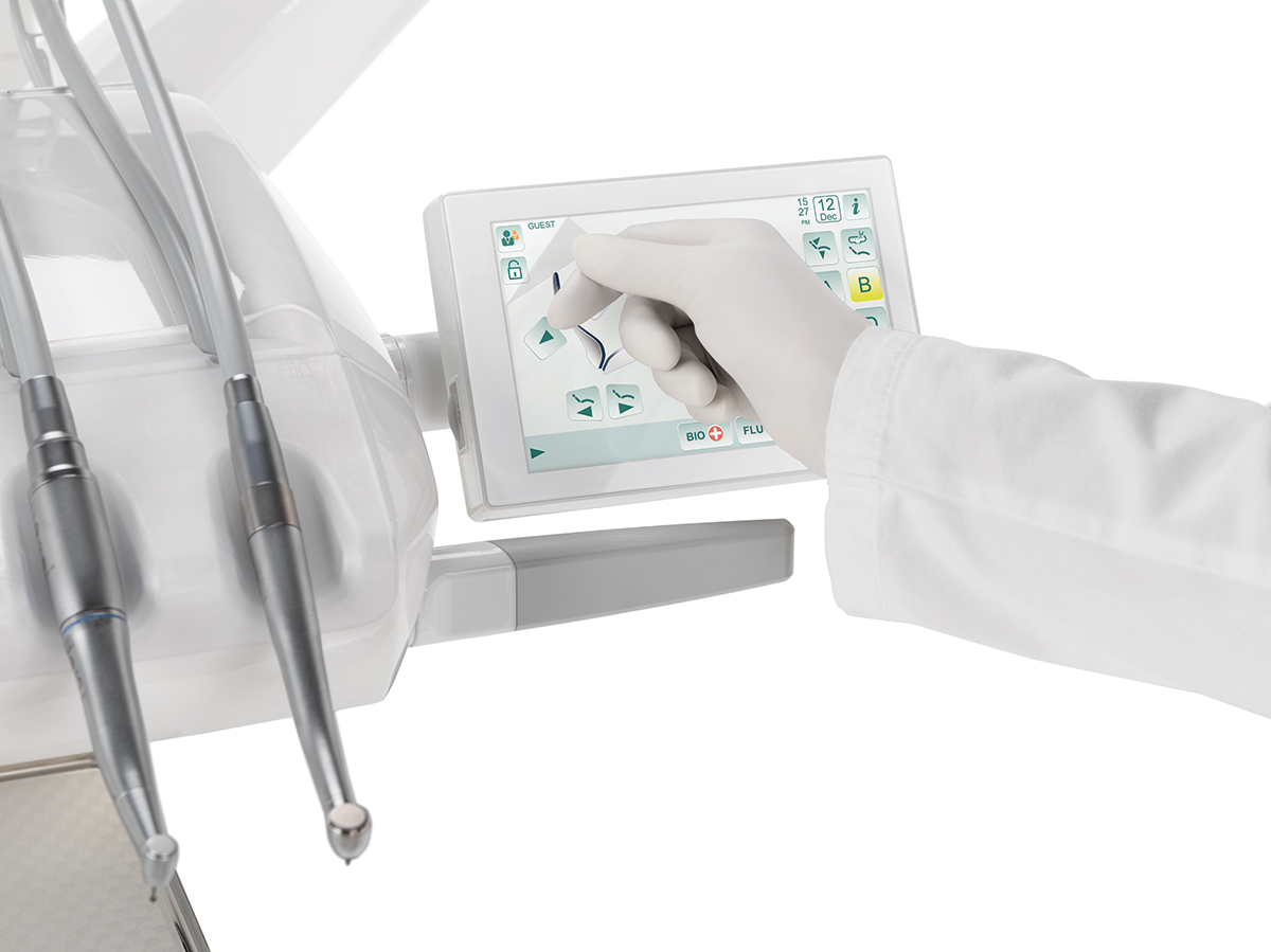 Управляемая с панели Full Touch, помпа встроенная в модуль врача, позволяет не занимать пространство модулями, тележками, реостатами.